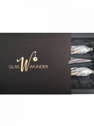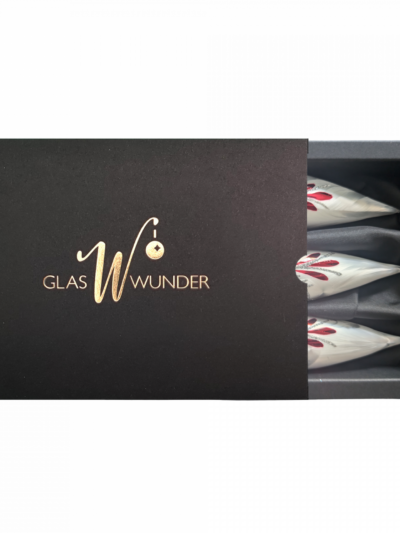 Dieses Set im passendem Design zum Waffelmuster besteht aus 3 jeweils 13 cm langen gedrehten Zapfen. Von Mund geblasen, liebevoll in Handarbeit gefärbt und verziert liegen diese 3 Zapfen auf einem Satinbett in einen edlen Naturkarton. Der weiße Lack in Icing Optik und die zarten roten Linien kommen elegant und dennoch kraftvoll daher. -