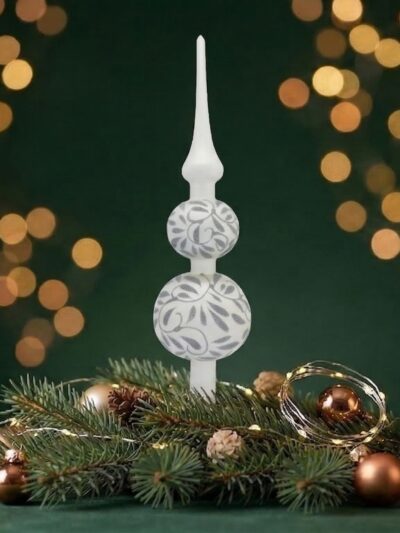 Diese Spitze ist 31cm groß. Sie präsentiert sich in einem strahlendem Silber sowie in einem feinem, mattem Silbergrau. Ihr zwei Glasbäuche sind von wunderschönen Ranken und Mistelzweigen verziert.