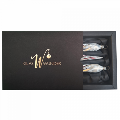 Dieses Set im passendem Design zum Waffelmuster besteht aus 3 jeweils 13 cm langen gedrehten Zapfen. Von Mund geblasen, liebevoll in Handarbeit gefärbt und verziert liegen diese 3 Zapfen auf einem Satinbett in einen edlen Naturkarton. Der weiße Lack in Icing Optik und die zarten roten Linien kommen elegant und dennoch kraftvoll daher. -