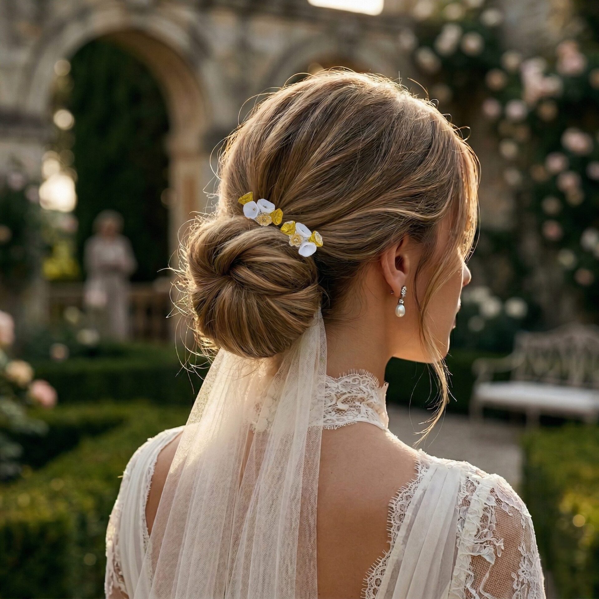 Haarspange aus Echtglas in Gelb-Weiß mit Blumen-Design. Edler Glanz, hochwertige Verarbeitung und sicherer Halt für stilvolle Frisuren.