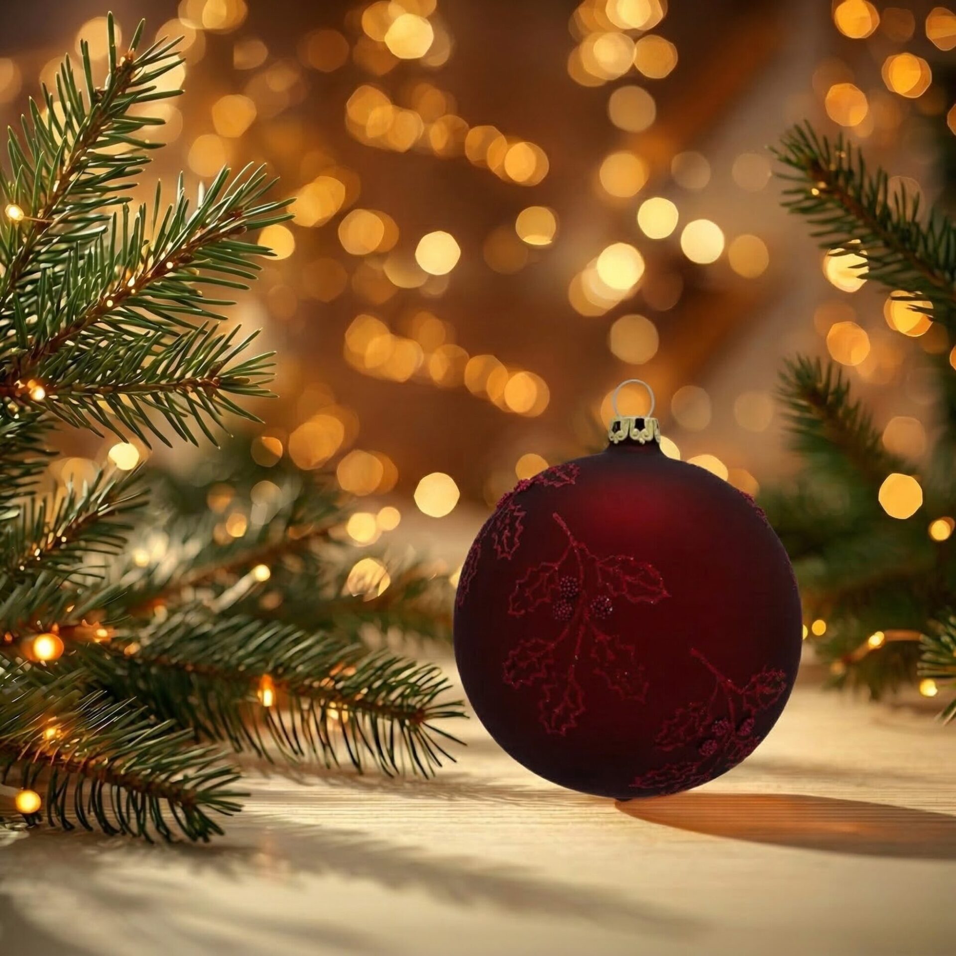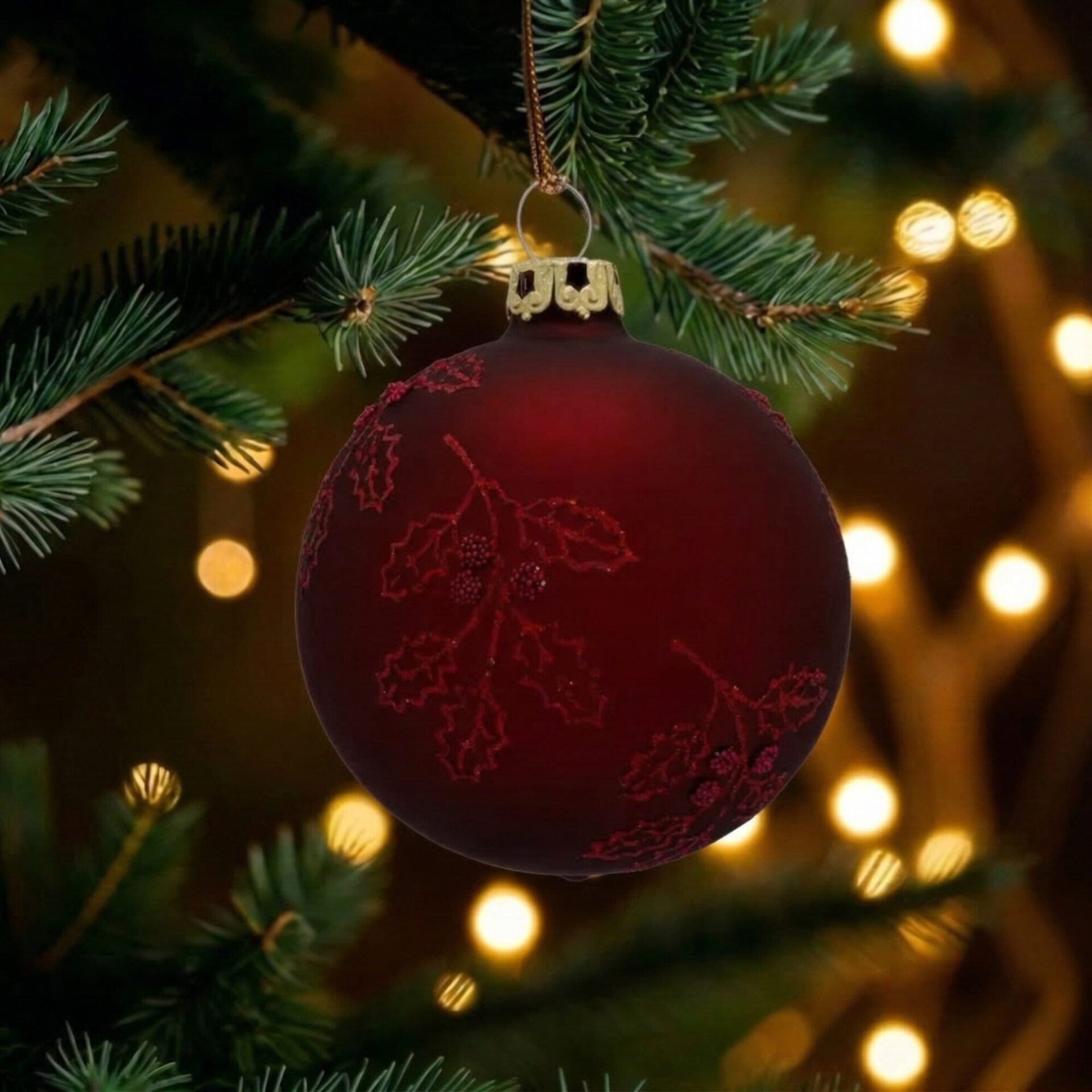 Diese edle Weihnachtskugel verbindet schlichte Eleganz mit festlichen Details. Aus mundgeblasenem Glas gefertigt, besticht sie durch ihr tiefes, mattes Dunkelrot, das für eine warme und luxuriöse Ausstrahlung sorgt. Ein zartes Ornament in gleichfarbigem Ton schmückt die Kugel und zeigt kunstvoll gestaltete Mistelzweige. Die kleinen Früchte sind mit feinen roten Perlen besetzt, die im Licht sanft schimmern und dem Dekor eine ganz besondere Tiefe verleihen. Mit ihrer harmonischen Farbgebung und den liebevollen Details ist diese Kugel ein stilvolles Highlight für den Weihnachtsbaum und zugleich ein außergewöhnliches Schmuckstück. Unser Set besteht aus 3 mundgeblasenen Kugeln aus Glas. Sie sind 8 cm groß, von Hand verziert und in Deutschland hergestellt. Durch ihre hochwertige Verarbeitung sind sie besonders langlebig und Pflegeleicht. Unsere Weihnachtskugeln sind nur für den Gebrauch im Innenbereich vorgesehen.