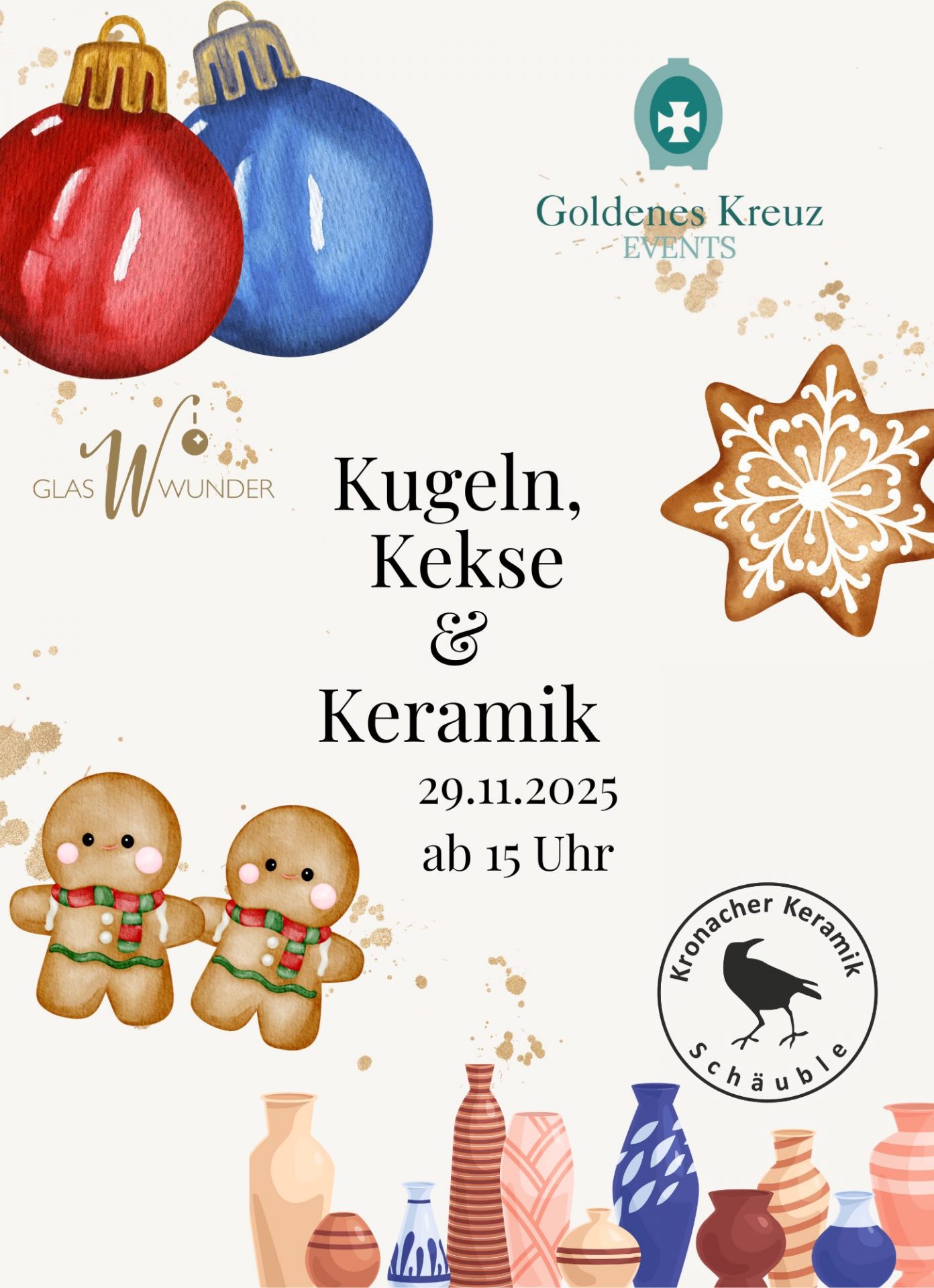 Am Samstag, 29.11.2025 laden wir dich herzlich ein zu einem besonderen Erlebnis: „Kugeln, Kekse & Keramik“ im Veranstaltungssaal des Goldenen Kreuzes Coburg. Ab 15 Uhr öffnet sich die Tür zu einem Nachmittag voller Kreativität, Genuss und vorweihnachtlicher Stimmung – speziell für Kinder und Familien.