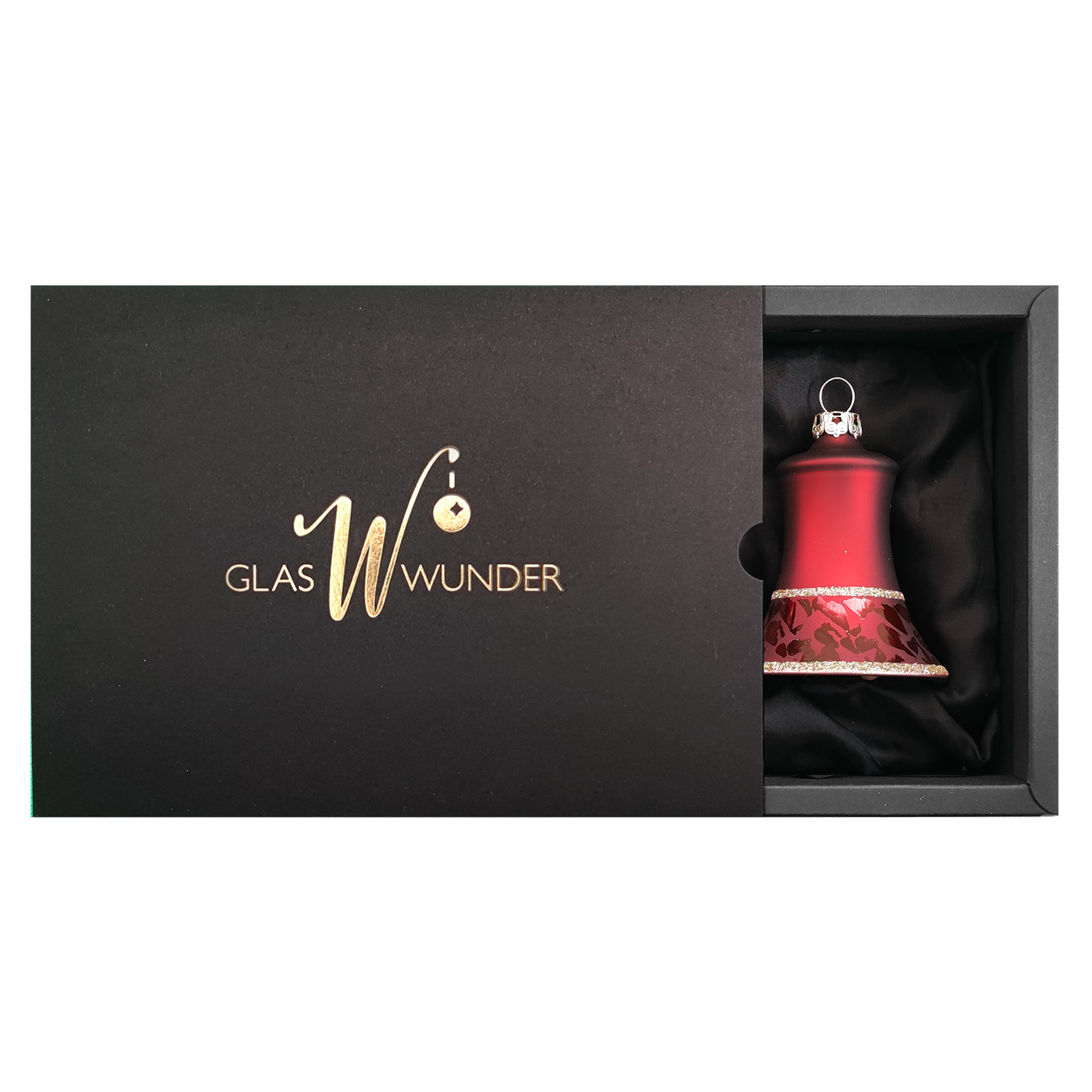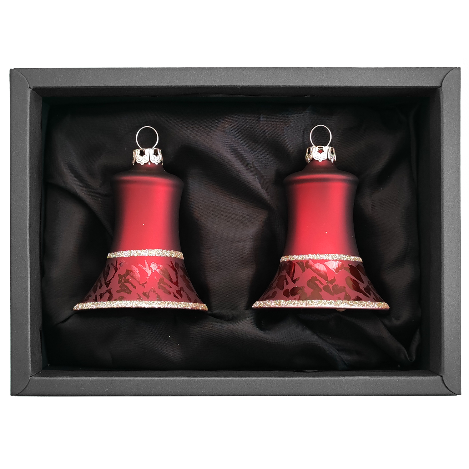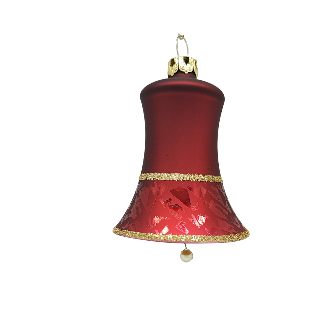 Dieses Glocken-Set besteht aus zwei 5 cm großen Glocken in einem dunkelrotem Mattton. Gerahmt durch zwei feine goldene Linien, sind die Glocken mit einem Softeffekt veredelt.