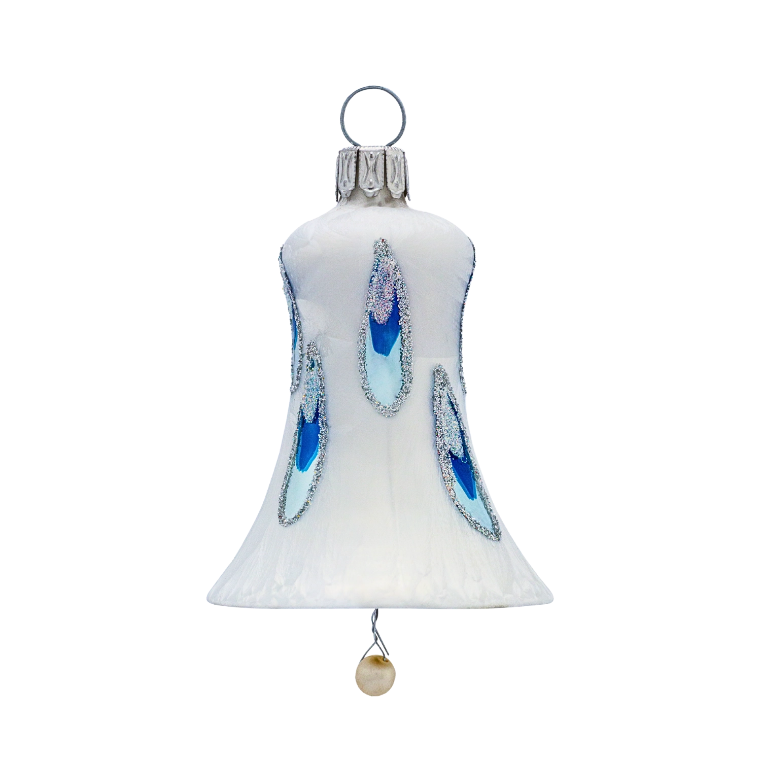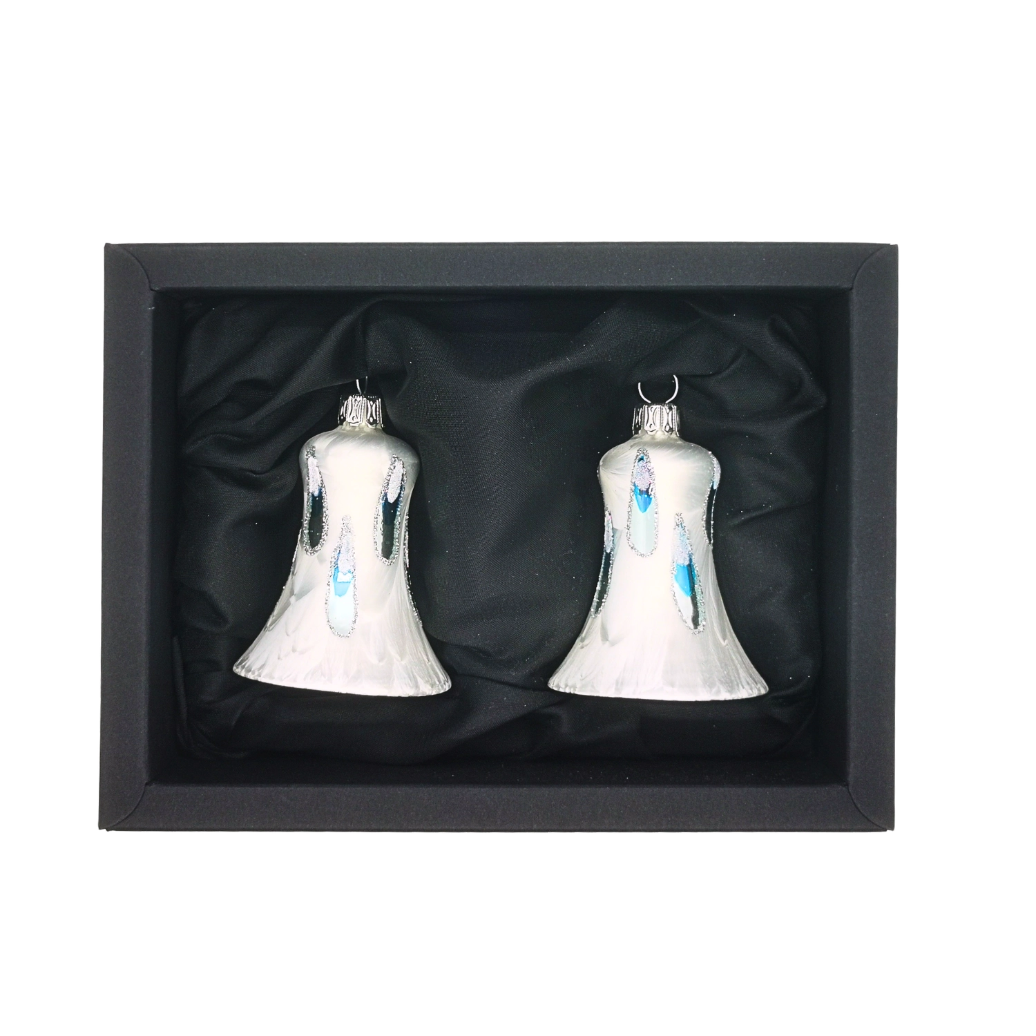 Dieses Glocken-Set besteht aus zwei 5 cm großen Glocken. Ein unsichtbares Läuten, das ganz still die Seele berührt, durch Ihr einzigartiges weißes Frost-Icing-Design. Mit Ihrem blau glänzenden Tropfen hebt es das noch besonders hervor.