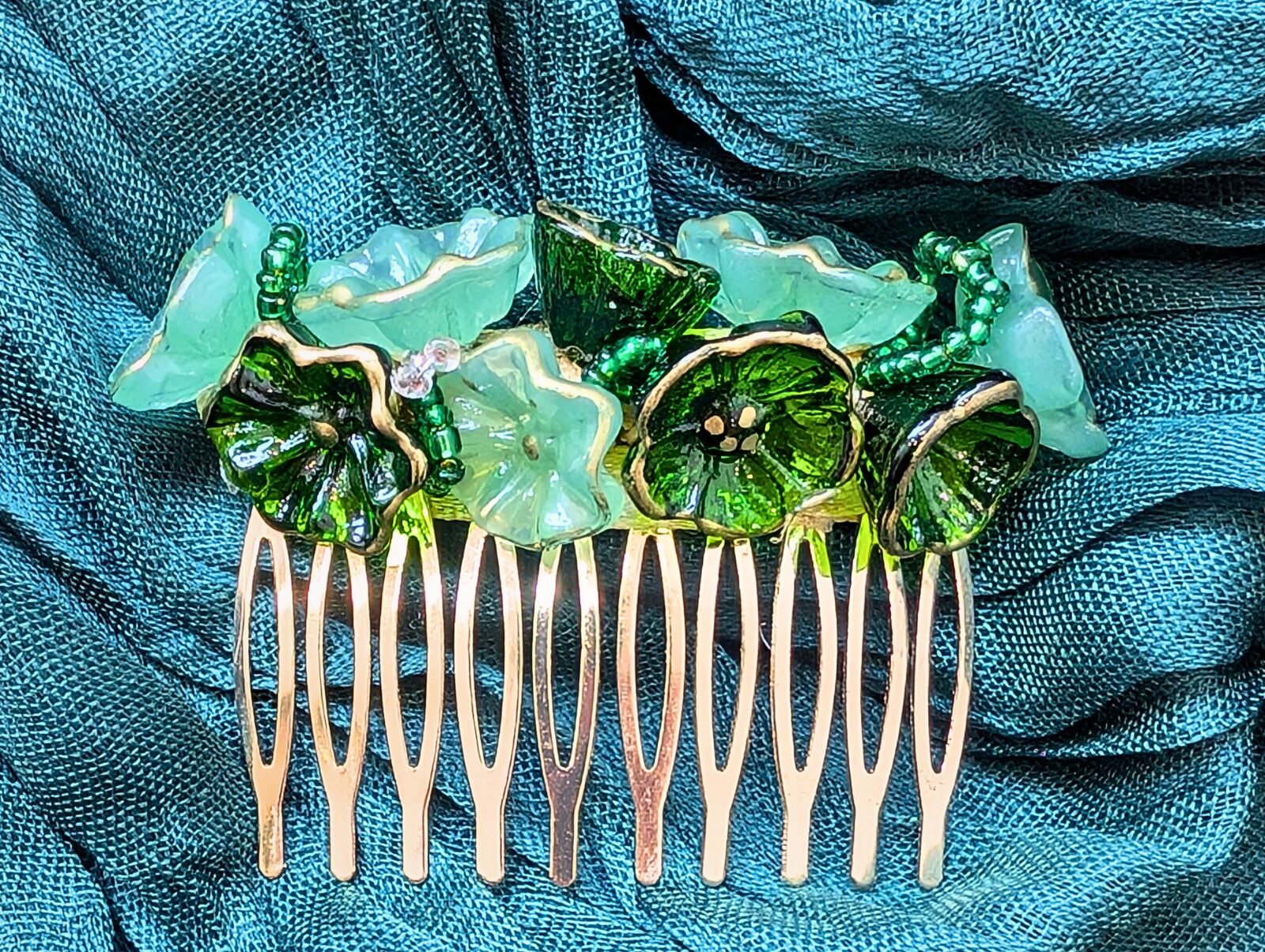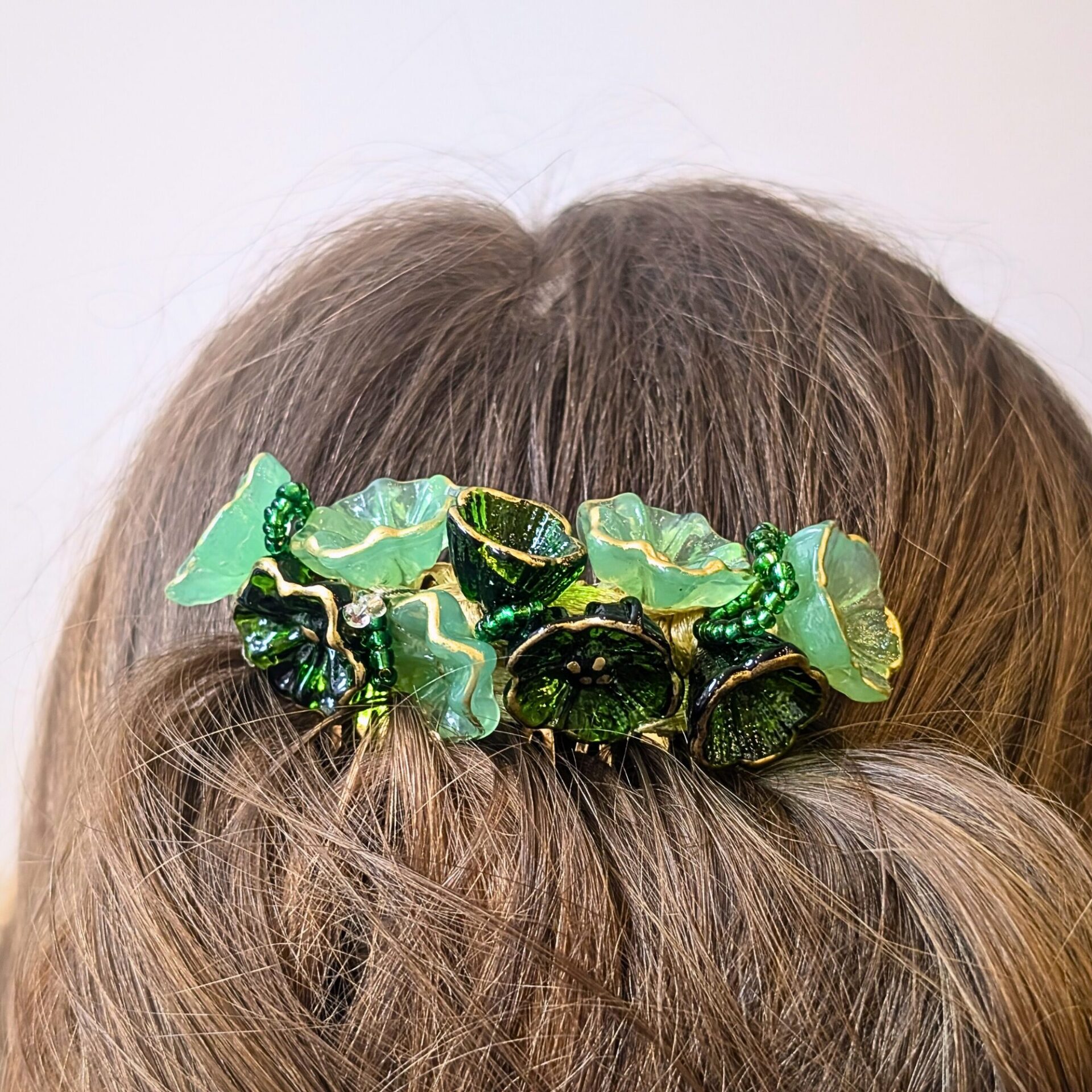 Diese elegante Haarspange ist vollständig aus hochwertigem Echtglas gefertigt und besticht durch ihre edle grüne Farbgebung. Die kunstvoll gestalteten Blumen-Elemente aus Glas verleihen dem Accessoire eine besondere Tiefe und einen stilvollen Glanz.