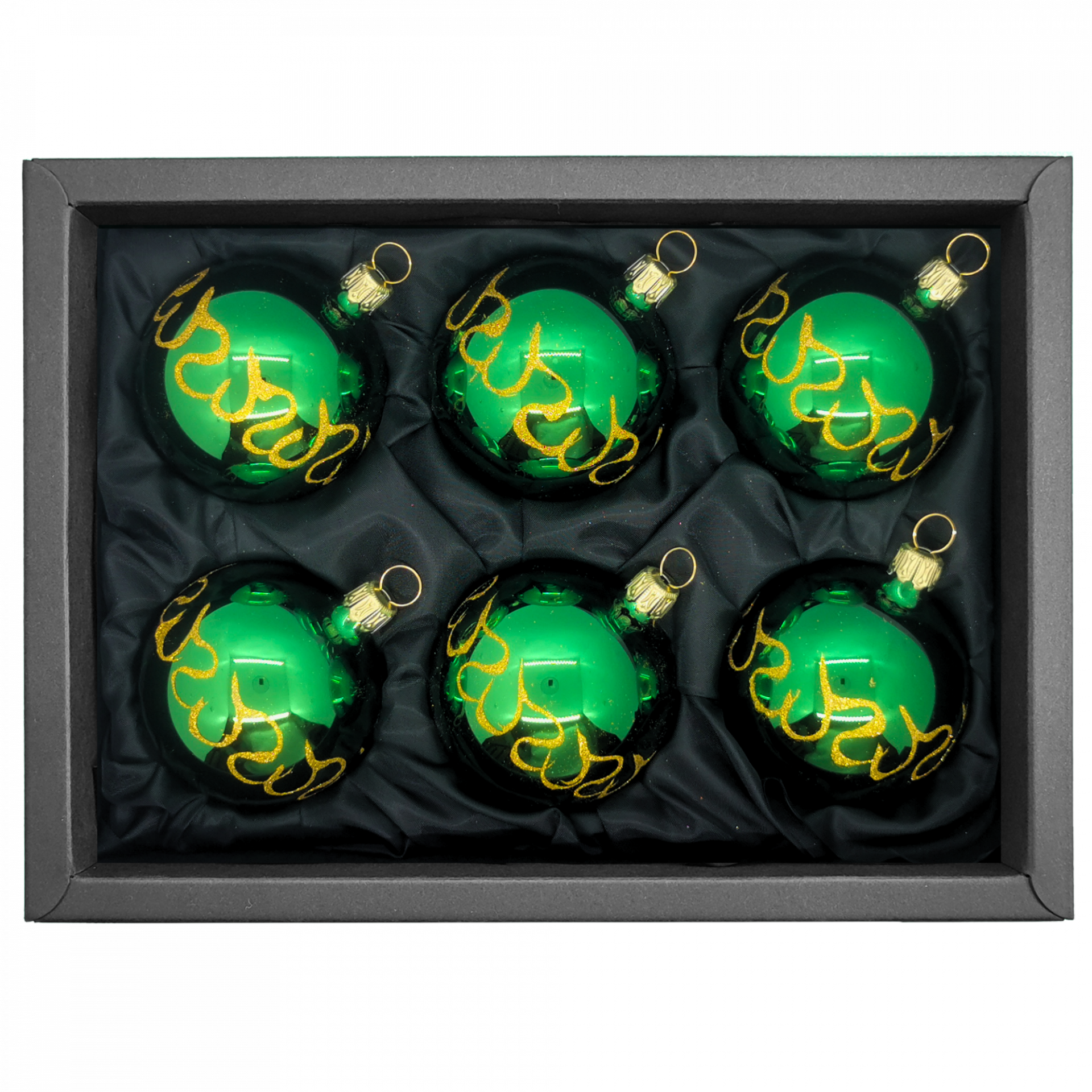 Dieses Set, bestehend aus 6 Kugeln à 6 cm in einem tiefen Irish Green und handbemalten Ornamenten in einem auffallenden Goldglitter sorgen für Wärme und Naturverbundenheit zugleich an deinem toll geschmückten Weihnachtsbaum.