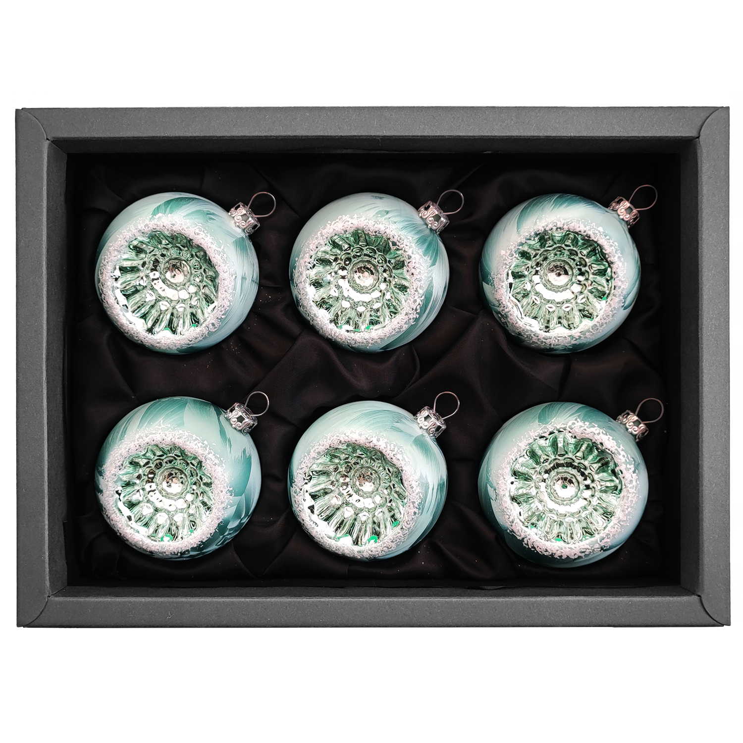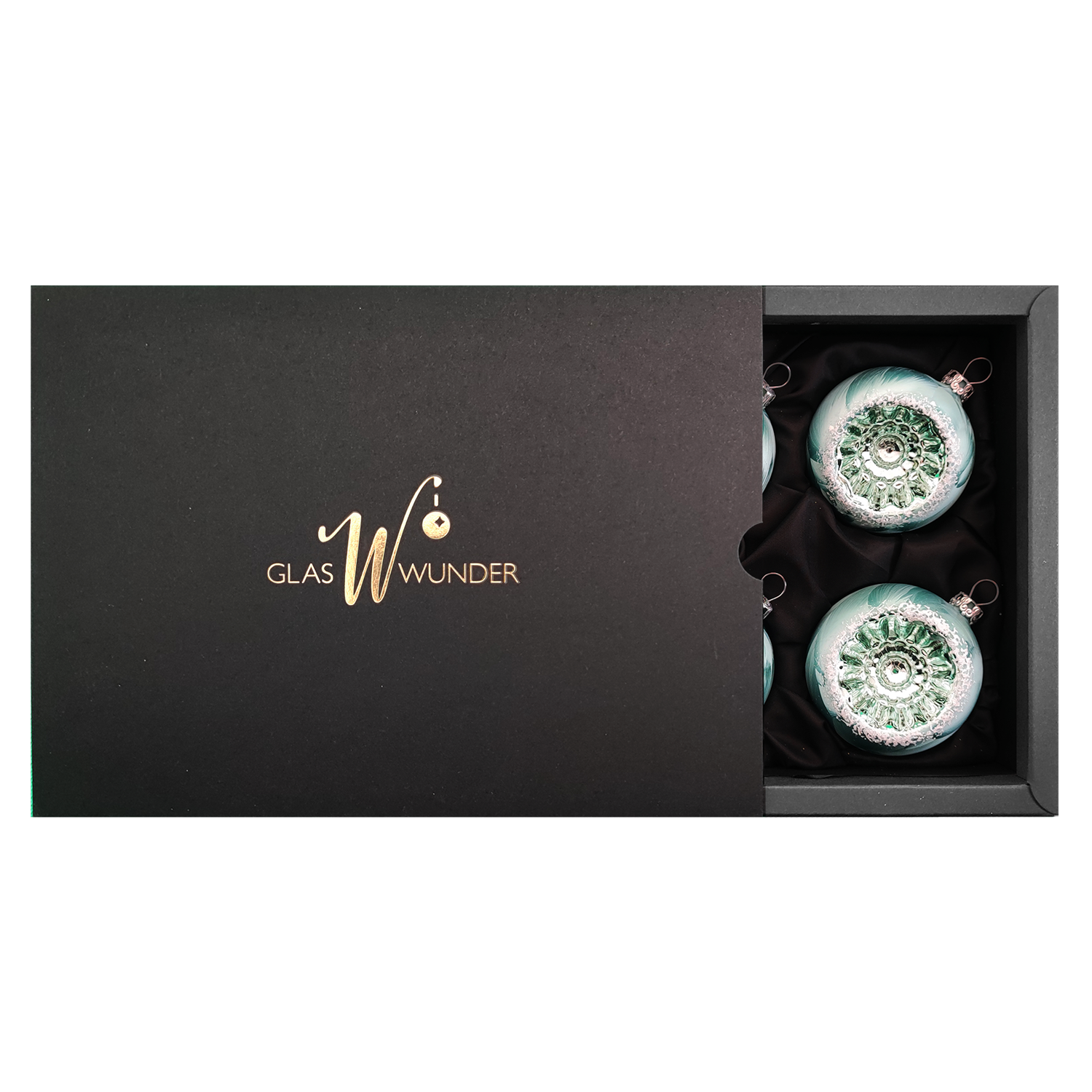 Zurück in die Vergangenheit. Mit unserem „Reflex on Frozen Nature“ – Set haben wir ein Retro Vintage- Design was uns and die Zeit erinnert ohne Verpflichtungen und voller Möglichkeiten. Unsere Kugeln sind dennoch mit einem sehr modernen und edlen Look versehen, der dein Weihnachtsbaum verzaubern lässt. Sie sind mit einem besonderen Ice Design in einem zarten mint grün gestaltet und schimmern in deiner ganzen Kreation voller Einzigartigkeit. Um eine kleine Zeitreise an deinem Weihnachtsbaum zu vollenden könntest du die Weihnachtskugeln prima mit unserem „