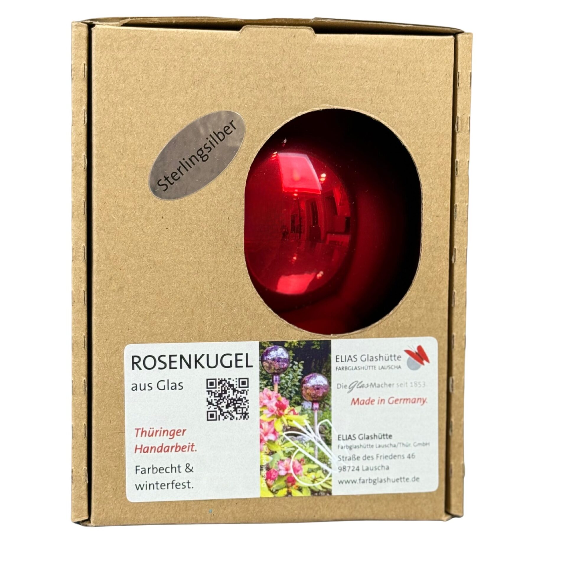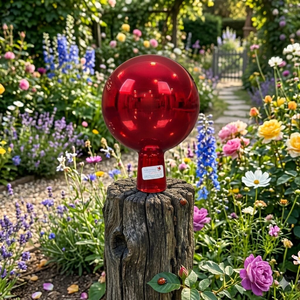 Mit ihrem intensiven Rotton passt die Glaskugel besonders gut zwischen Rosen, Blumen oder grünen Pflanzen und bringt Wärme und Farbe in jede Gartengestaltung. Ob auf einem Rosenstab oder dekorativ im Beet platziert – diese Rosenkugel verleiht jedem Außenbereich eine stilvolle und harmonische Atmosphäre.