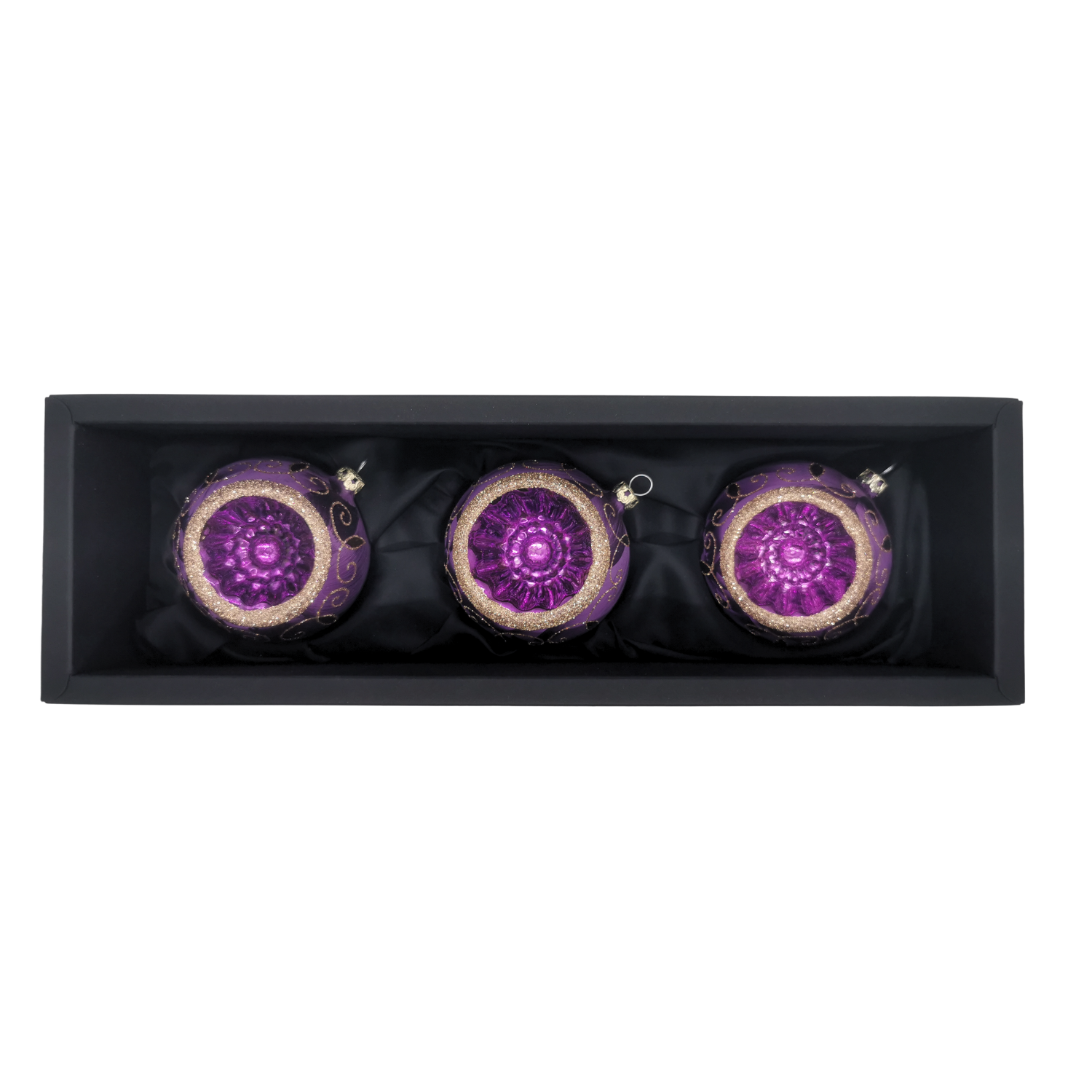 Dieses nostalgische Set besteht aus 3 Kugeln á 8cm. In einem kräftigen, dunklen Lila und einem funkelnden Kranz aus Silber- und Goldglitter verziert, zaubert sie deinem Weihnachtsbaum ein sehr harmonisches und warmes Licht.