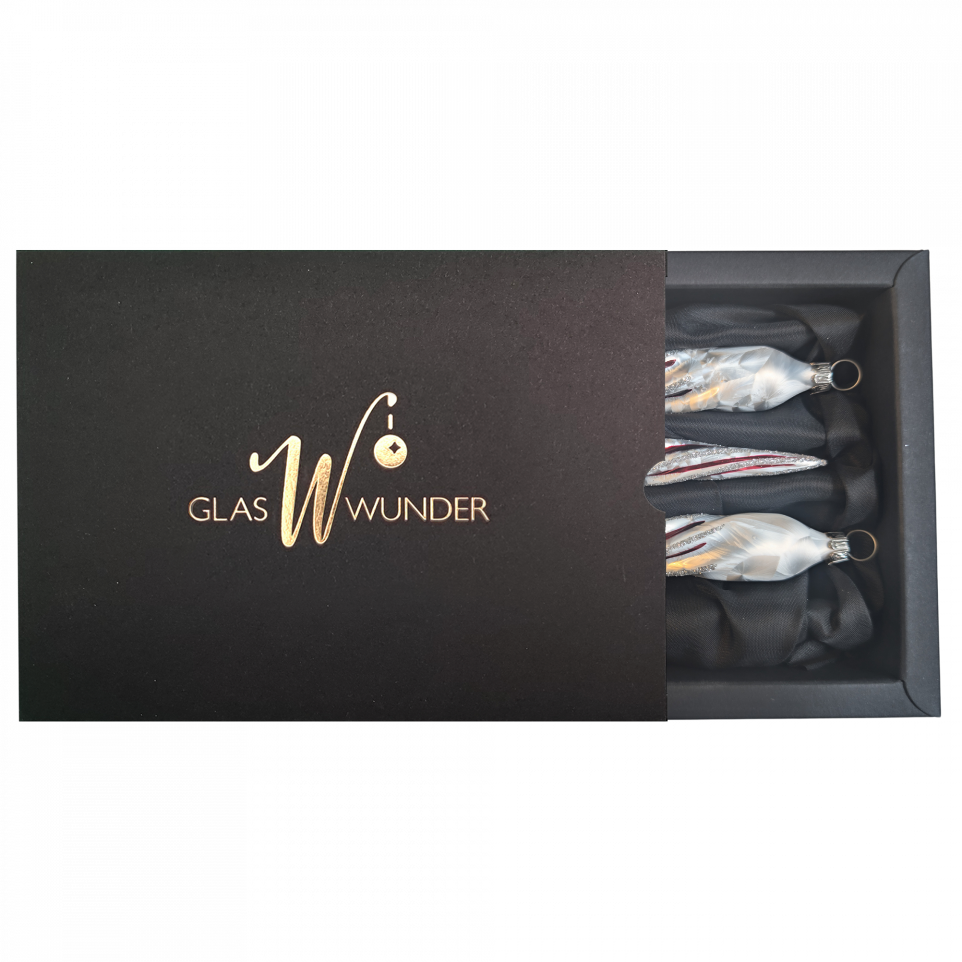 Dieses Set im passendem Design zum Waffelmuster besteht aus 3 jeweils 13 cm langen gedrehten Zapfen. Von Mund geblasen, liebevoll in Handarbeit gefärbt und verziert liegen diese 3 Zapfen auf einem Satinbett in einen edlen Naturkarton. Der weiße Lack in Icing Optik und die zarten roten Linien kommen elegant und dennoch kraftvoll daher.