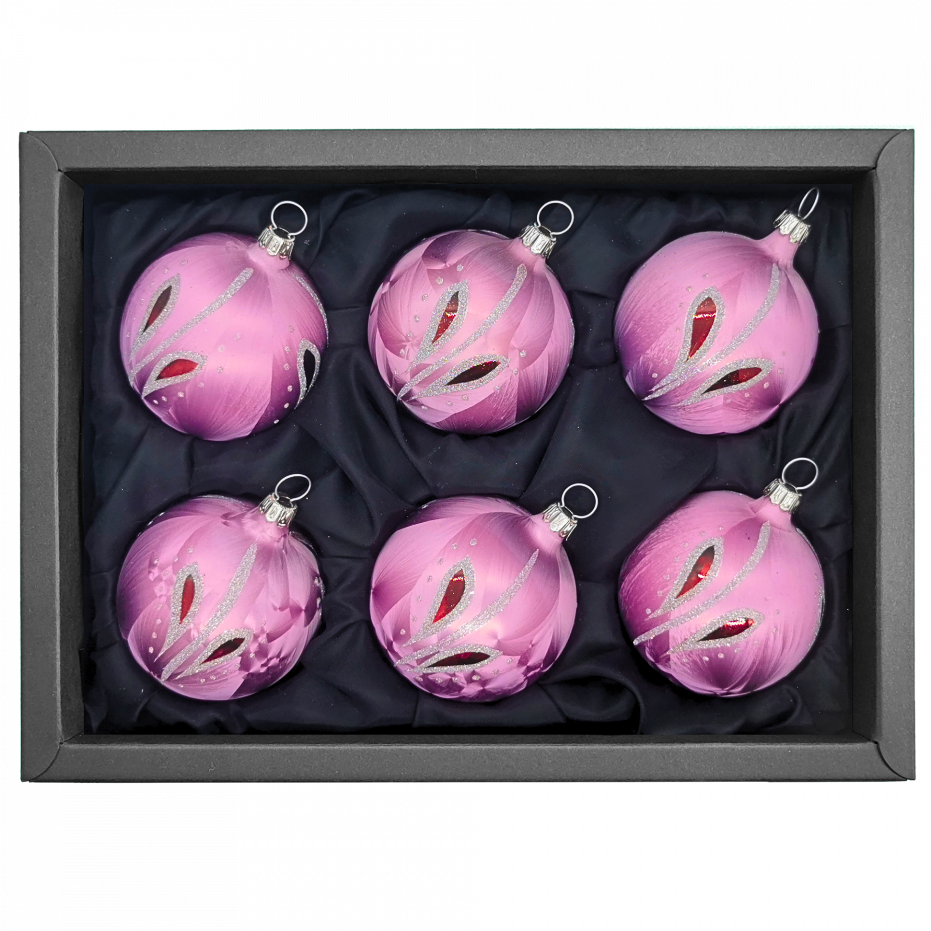 Dieses Set, bestehend aus 6 Kugeln à 6 cm in einem matten Rosaton und einem speziell verarbeitetes Icing-Design überzeugen zusätzlich mit einem Tropfen der beidseitig mit in einem glänzenden Rot, umrahmt von funkelndem Silberglitter aufleuchten.