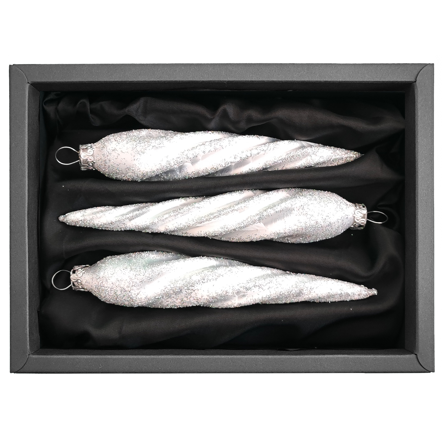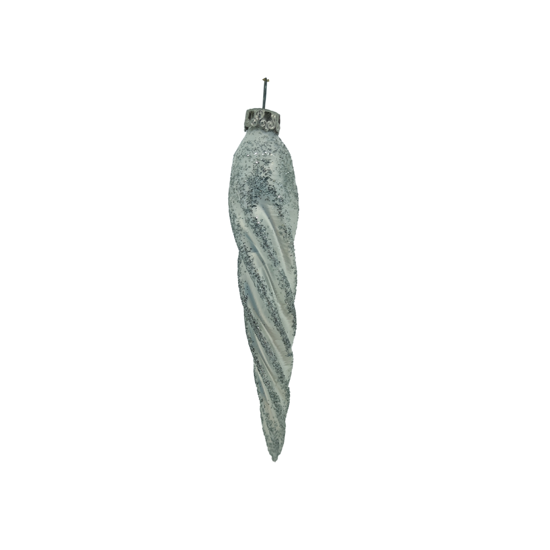 Startseite » Shop » „twisted frost“ – gedrehte Zapfen 11 cm | Christbaumschmuck weiß geglittert